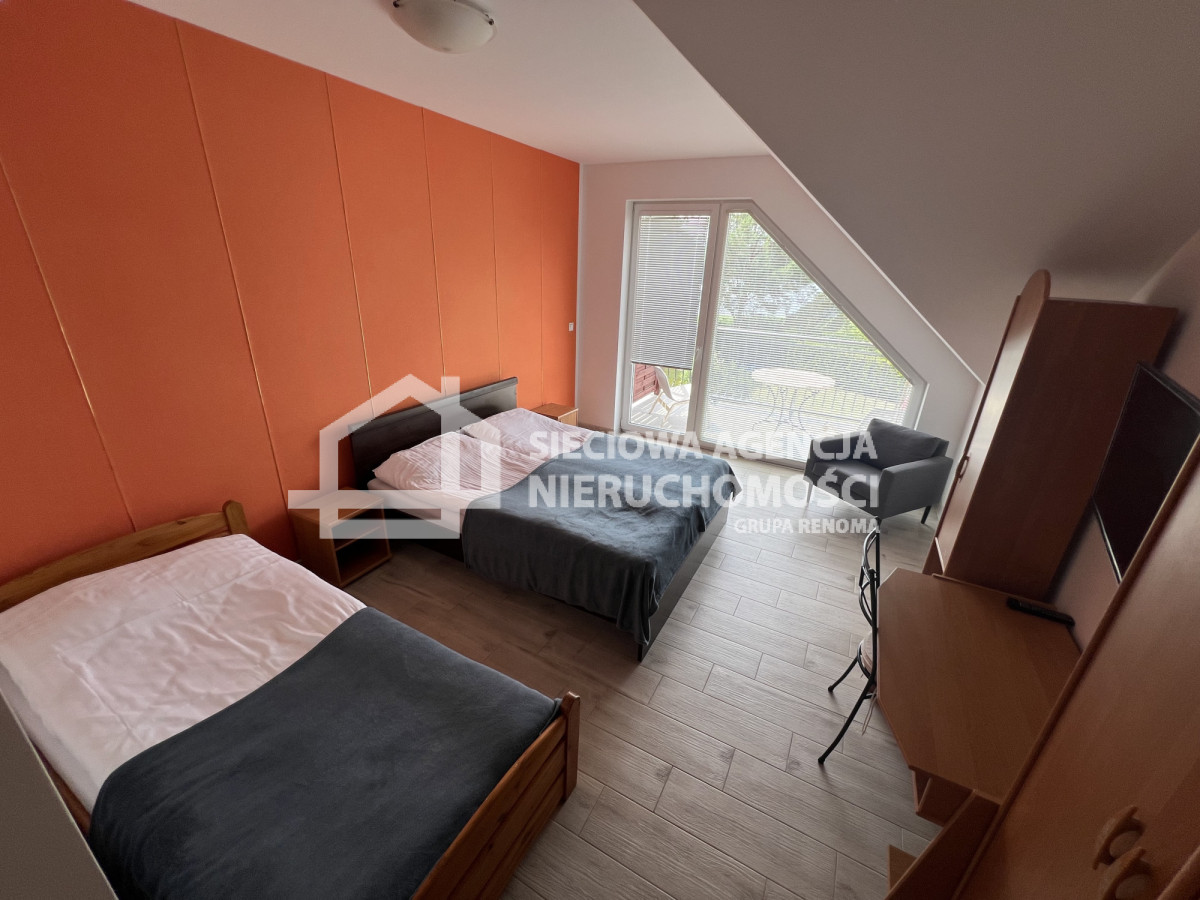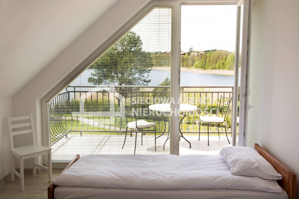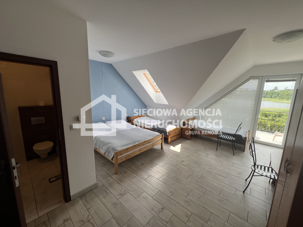 piękne widoki na jezioro z każdego pokoju.Parametry nieruchomości: 8 pokoi, 6 sypialni, 5 łazienek, 3 kuchnie, maksymalnie do 20 miejsc noclegowych, budynek gospodarczy 50 m kw., 10 miejsc parkingowych, sauna ogólnodostępna.