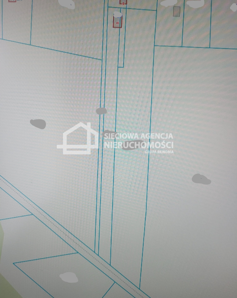 Działka w kształcie prostokąta (34 m x 266 m), media : woda, prąd, kanalizacja oddalone ok 260 m.