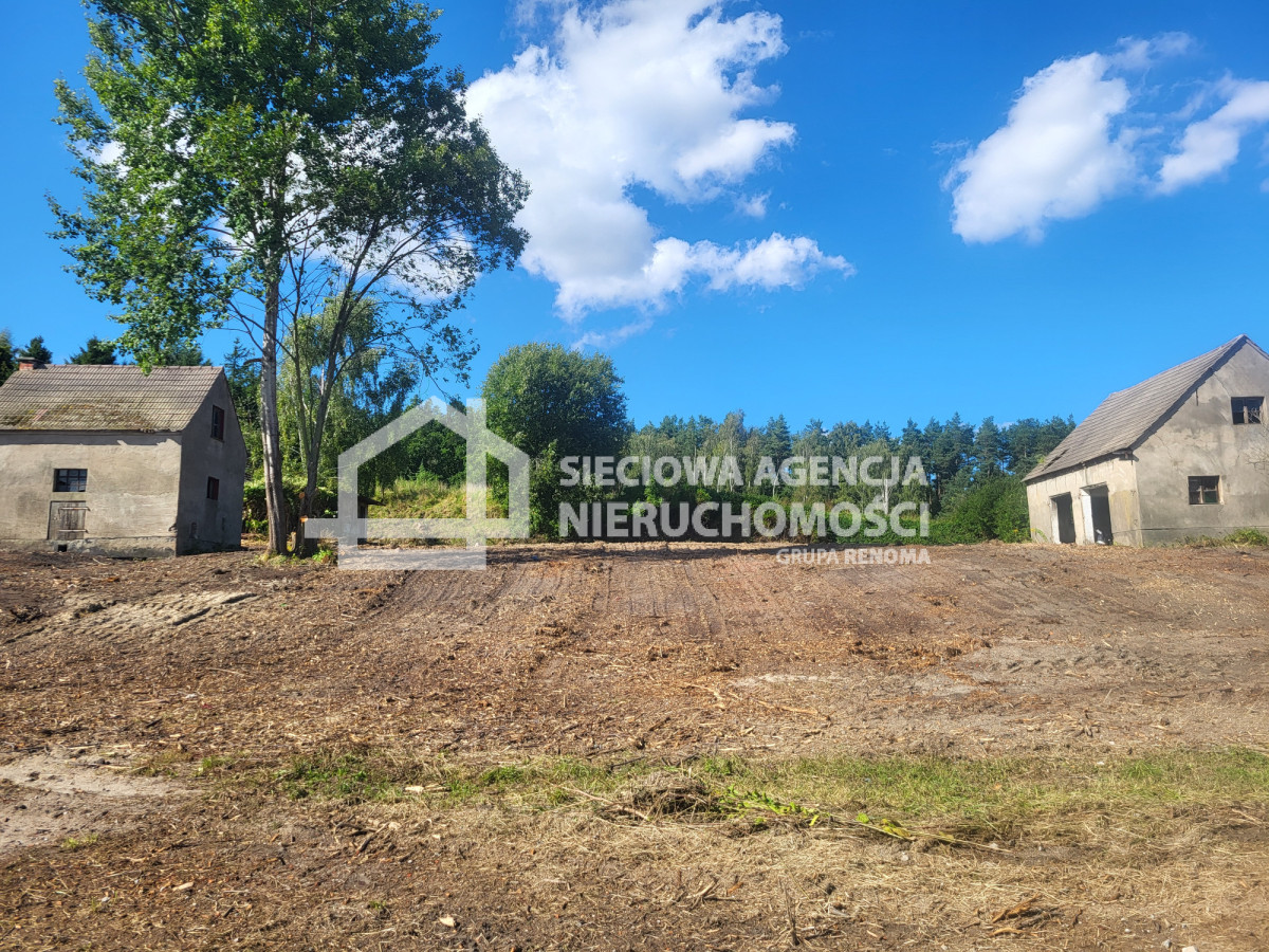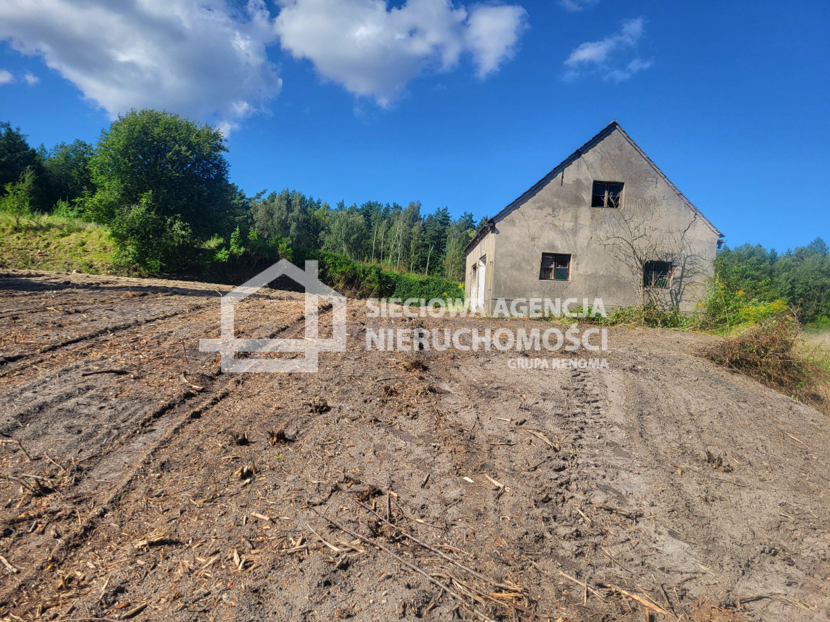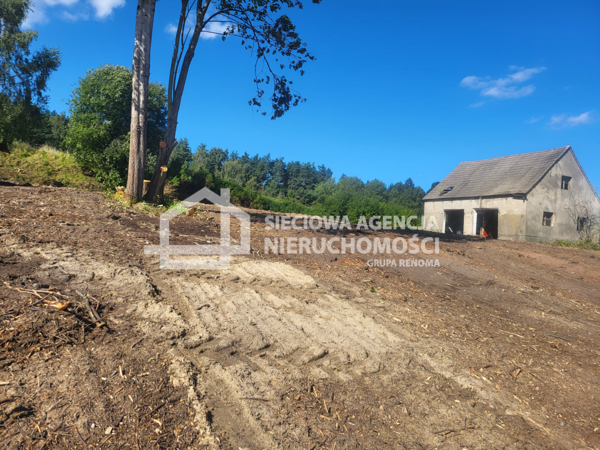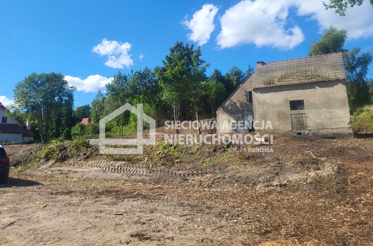 Działka ma kształt prostokąta z tyłu skarpa.. Położona na lekkim wzniesieniu nad drogą. Na działce stare budynki do rozbiórki.