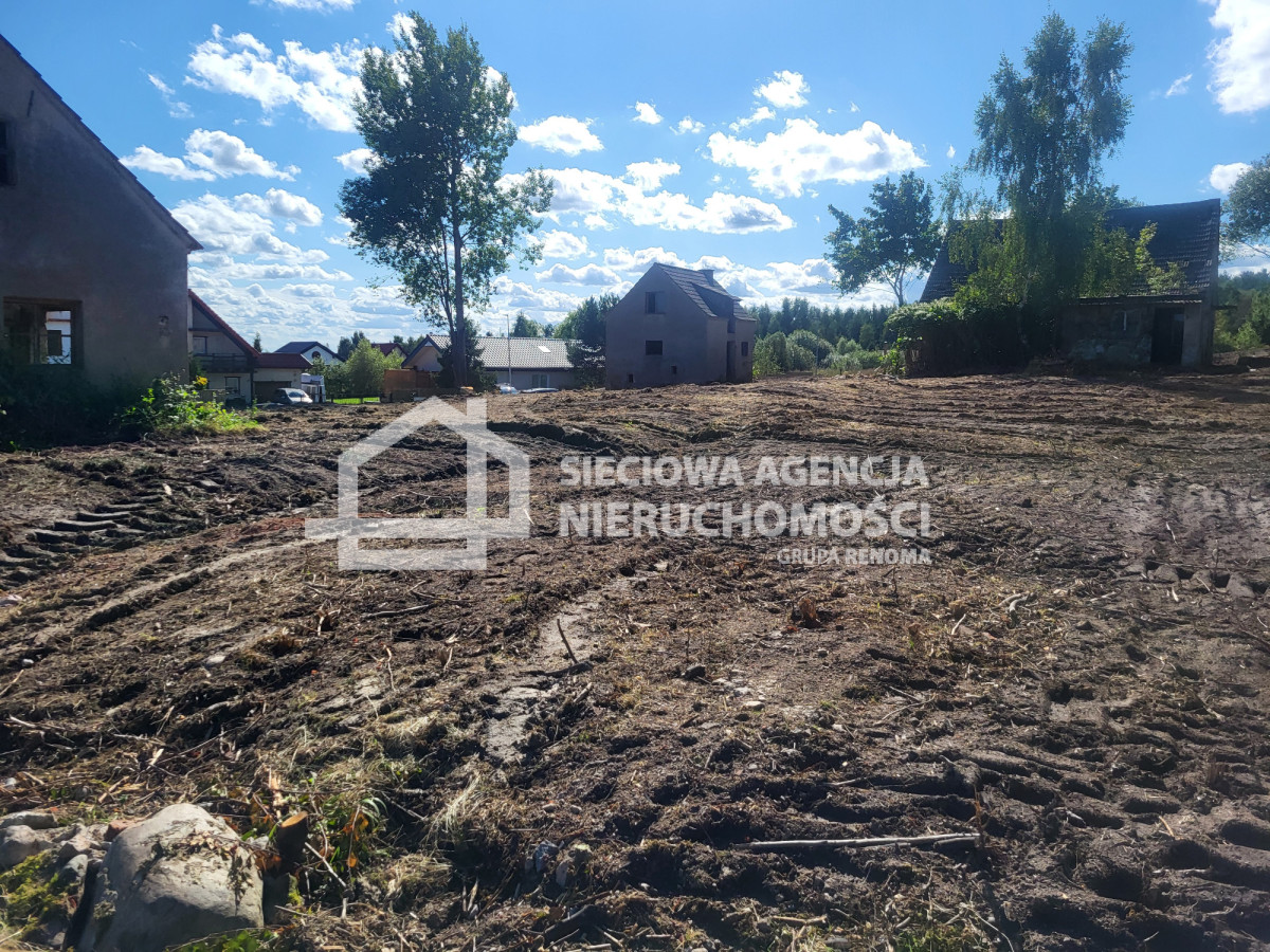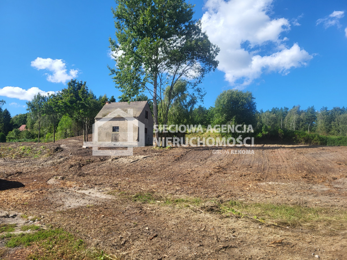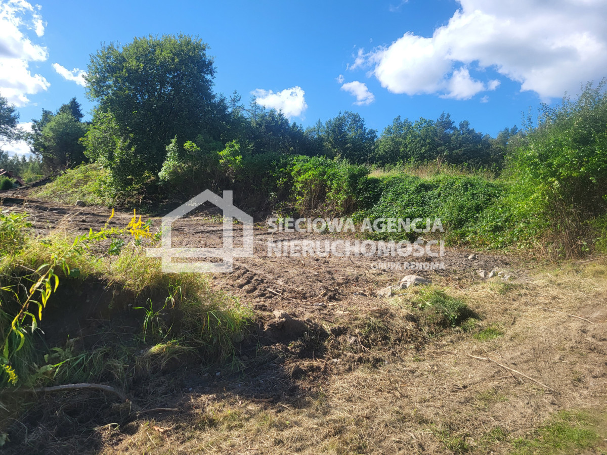 Działka ma kształt prostokąta z tyłu skarpa.. Położona na lekkim wzniesieniu nad drogą. Na działce stare budynki do rozbiórki.