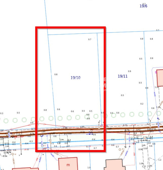 Media: skrzynka prądowa na działce, kanalizacja i woda w drodze przy działce.