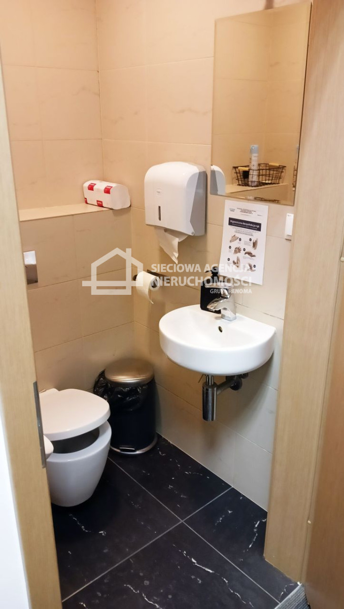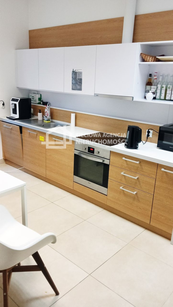 Biuro jest wyposażone w kuchnię i toalety.