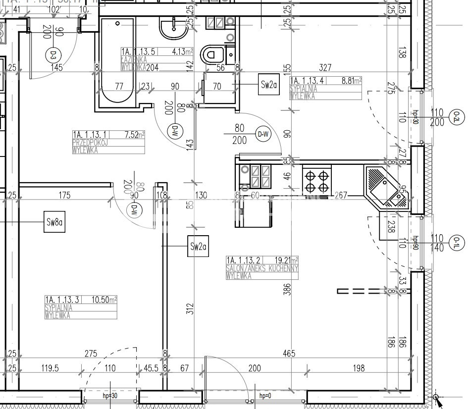 Układ: salon z aneksem kuchennym + 2 sypialnie + łazienka