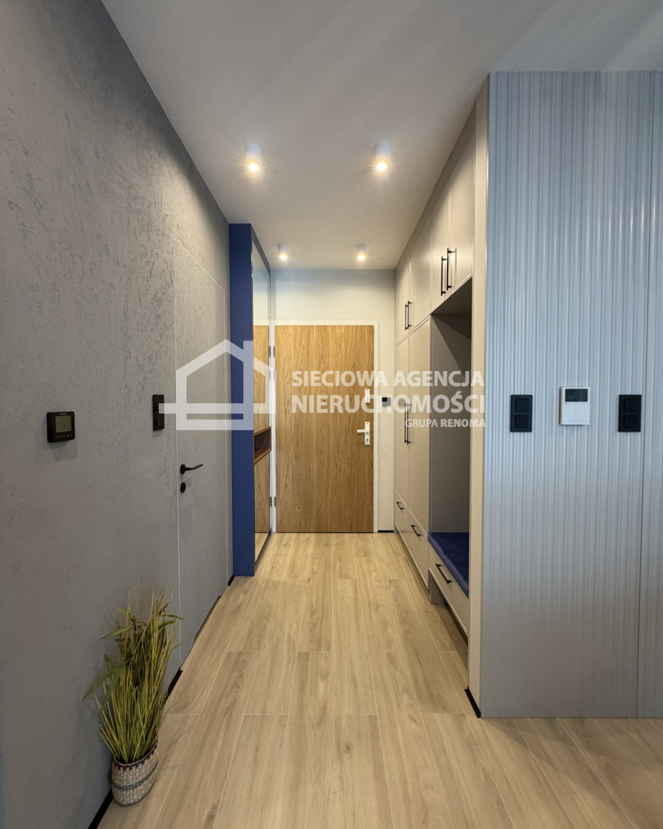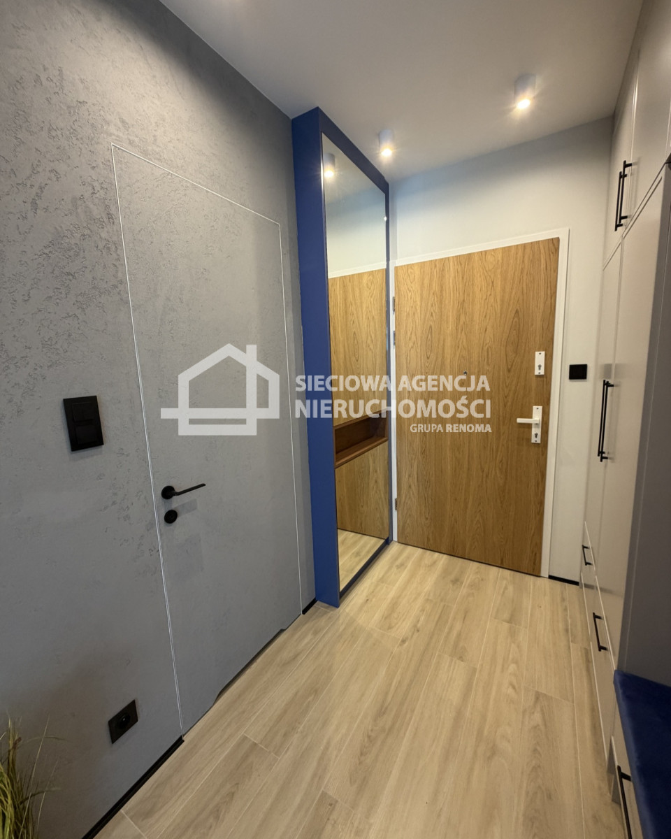 W skład apartamentu wchodzi salon z aneksem kuchennym, sypialnia z szafą w zabudowie, łazienka z kabiną prysznicową i WC oraz przedpokój z szafą w zabudowie i siedziskiem.
