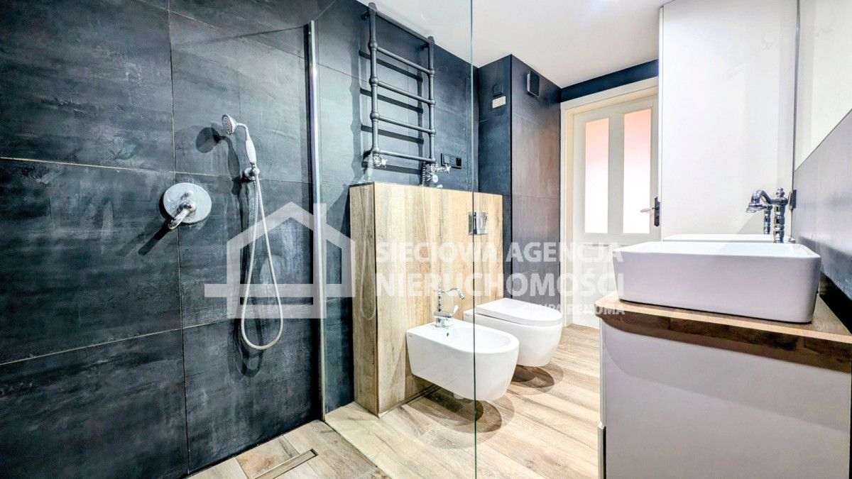 -nowoczesna łazienka z dużym prysznicem, WC i bidetem - wygodna dla całej rodziny.