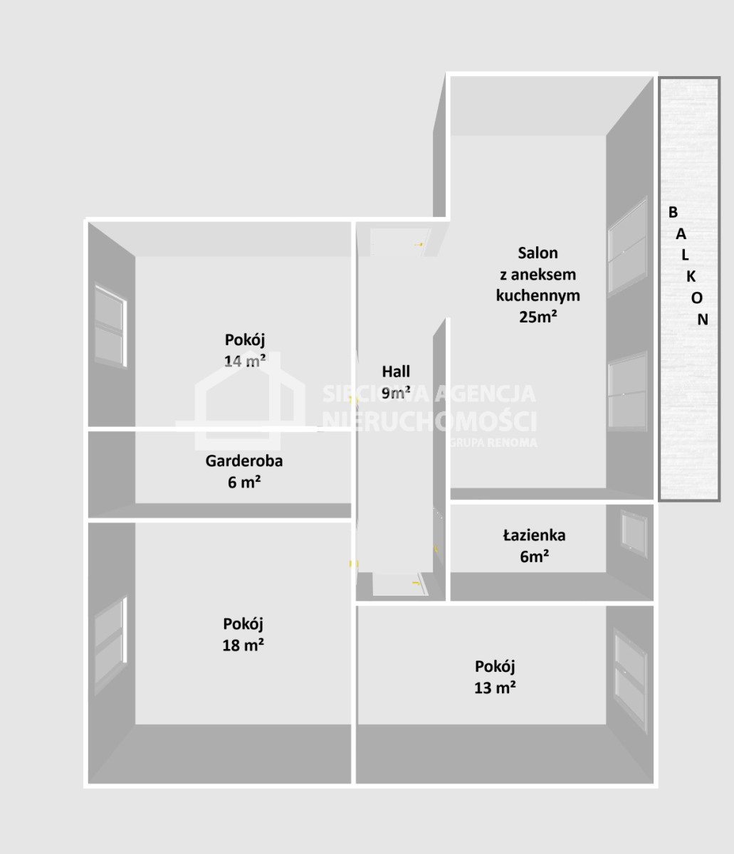 -trzy przestronne, dobrze doświetlone pokoje: 18 m² , 14 m² z oddzielną garderobą (6 m²) i 13 m².