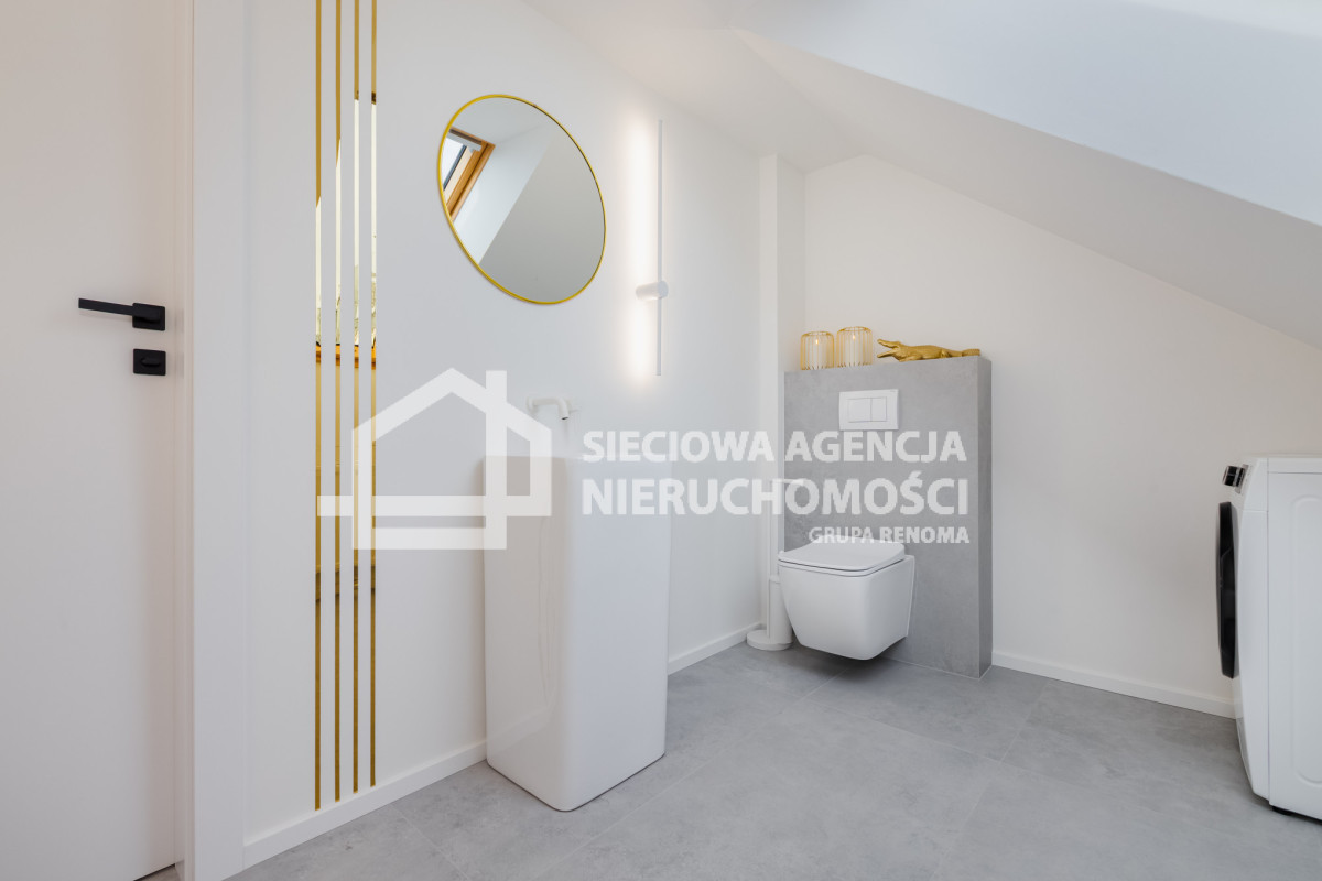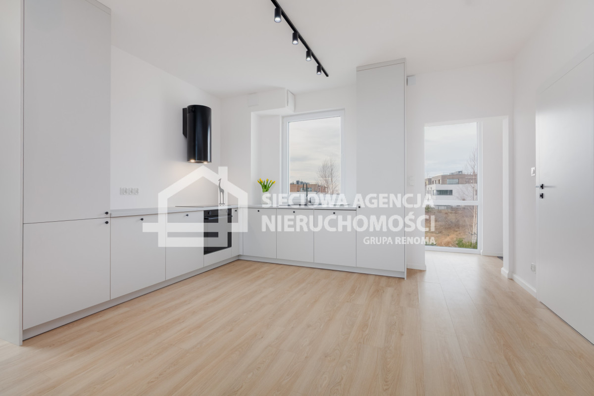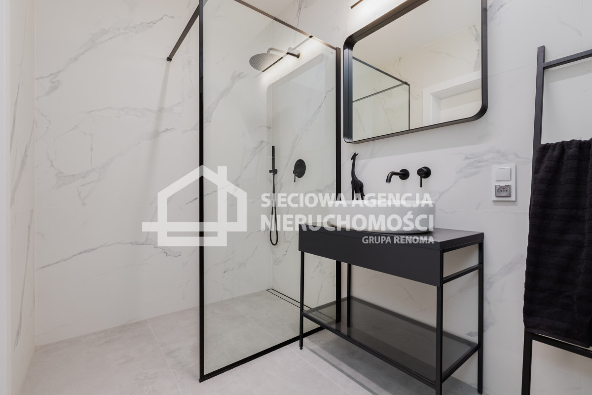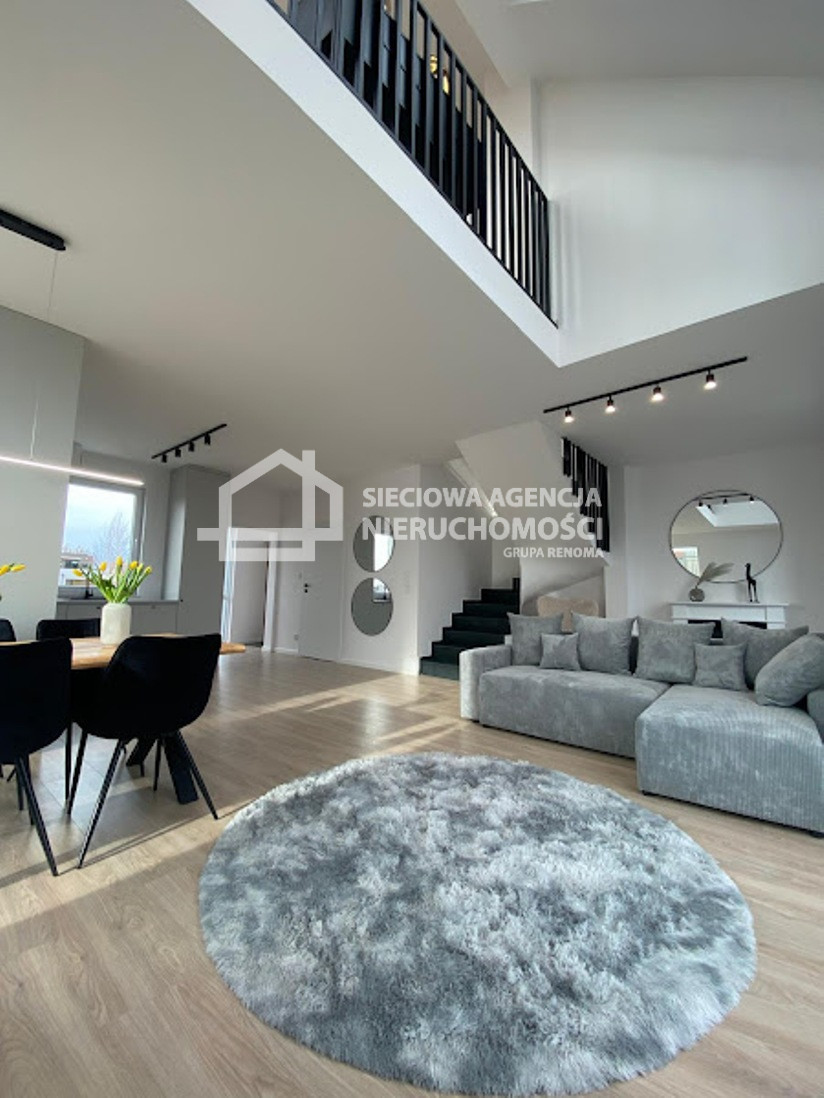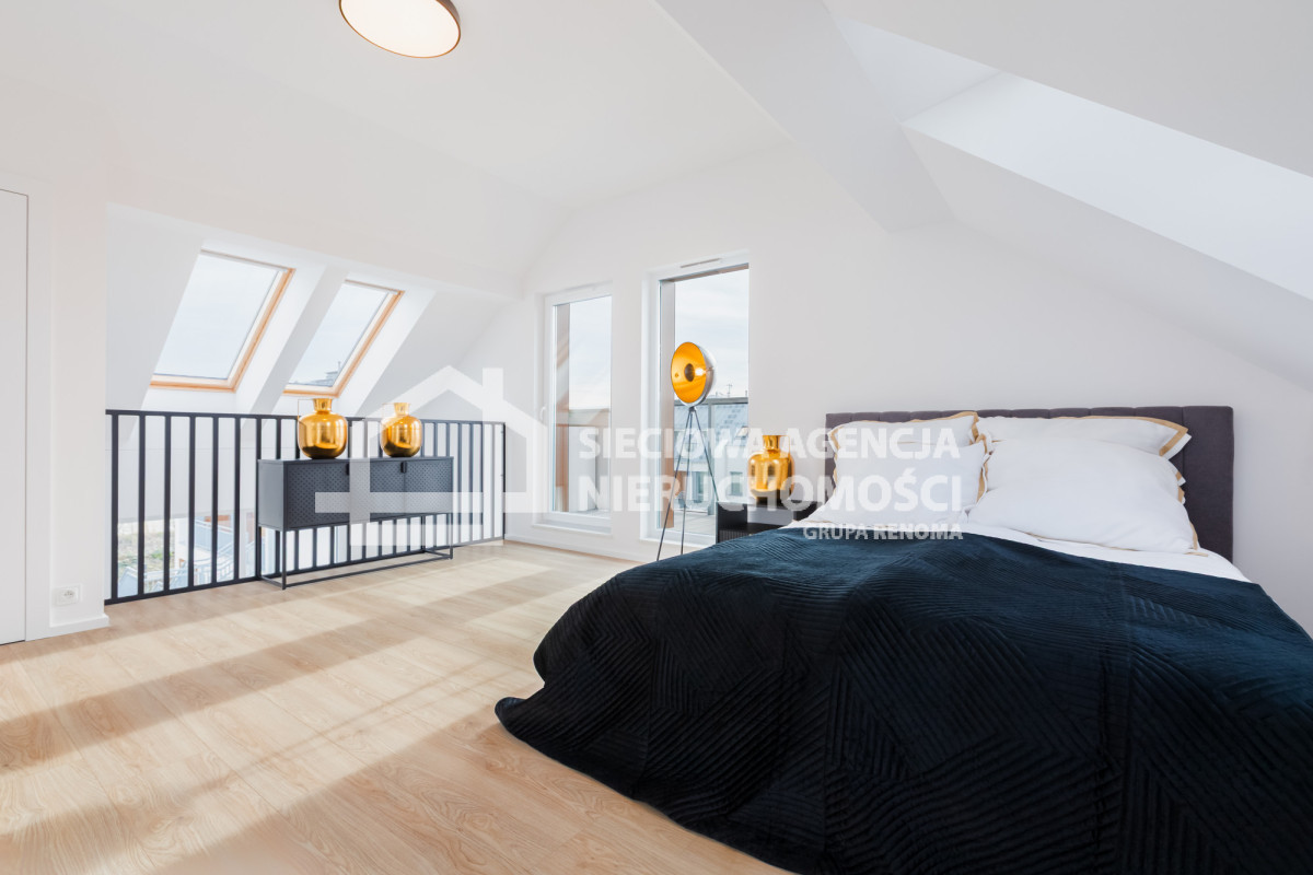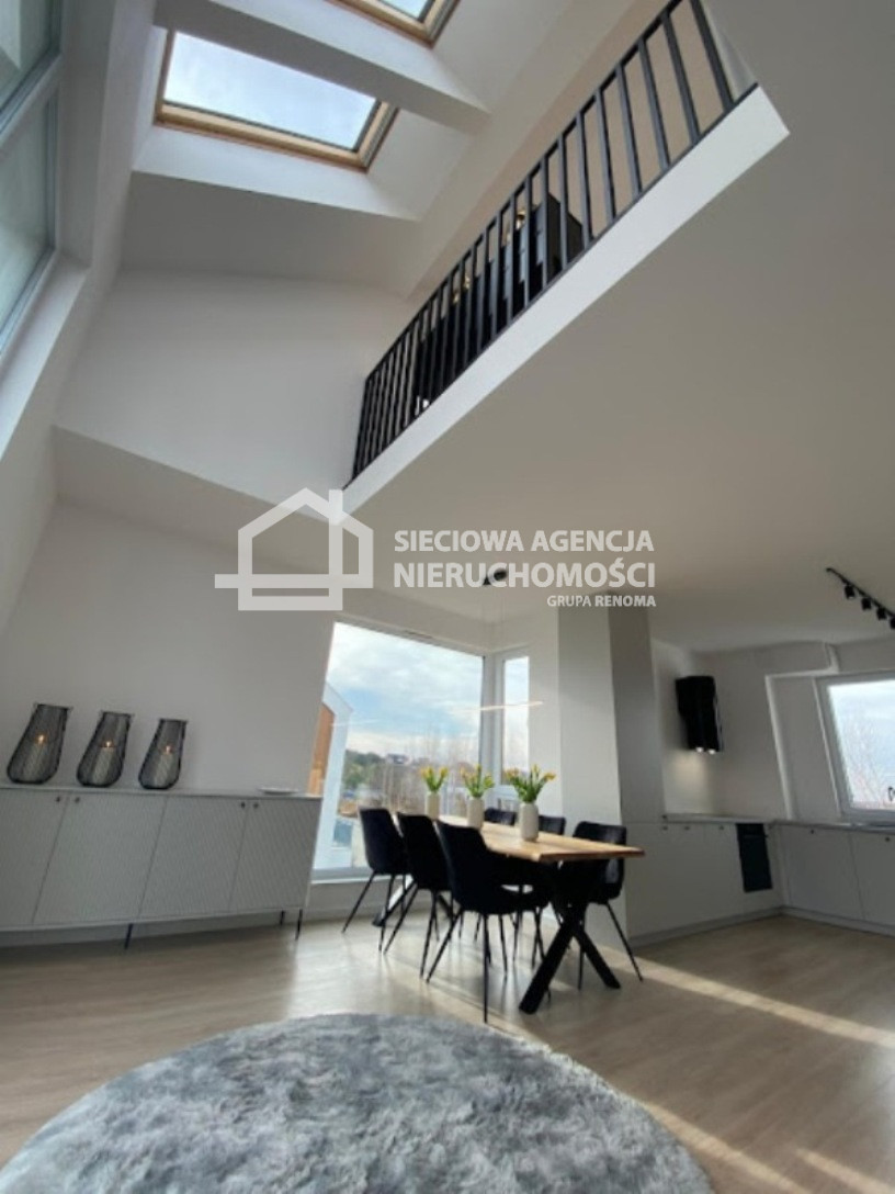 Apartament z antresolą oraz panoramicznymi przeszkleniami, salon, kuchnia, sypialnia premium + dwie eleganckie łazienki.