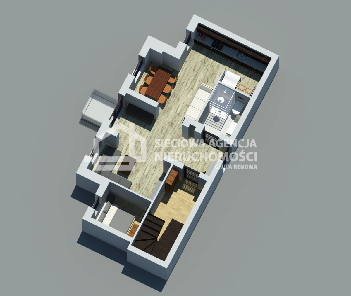 Poziom pierwszy to : salon z otwartą kuchnią i jadalnią a także z wyjściem na balkon , łazienka z kabiną prysznicową i WC oraz przedpokój.