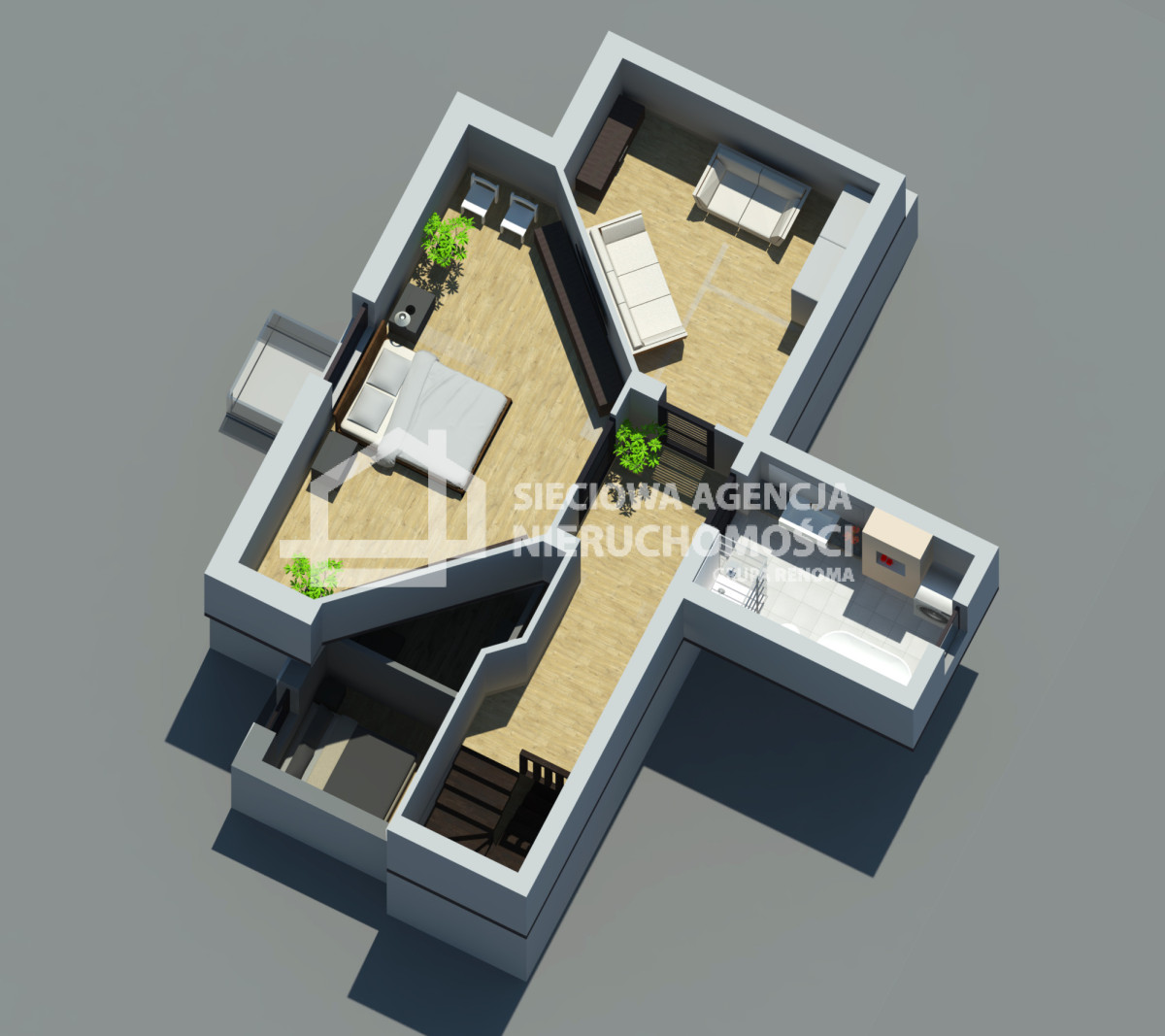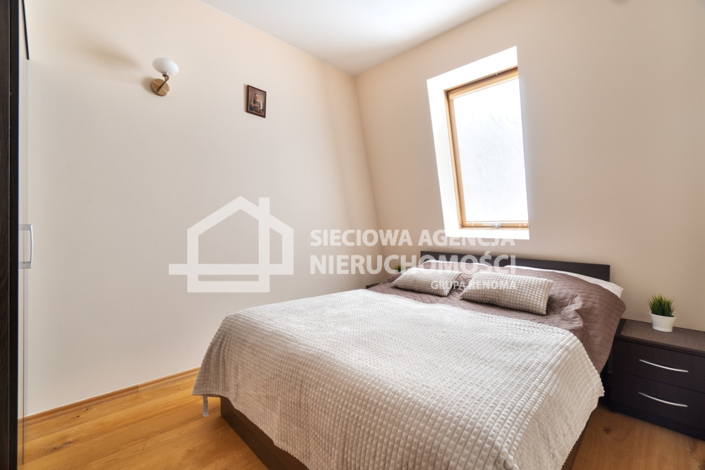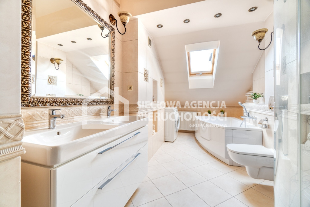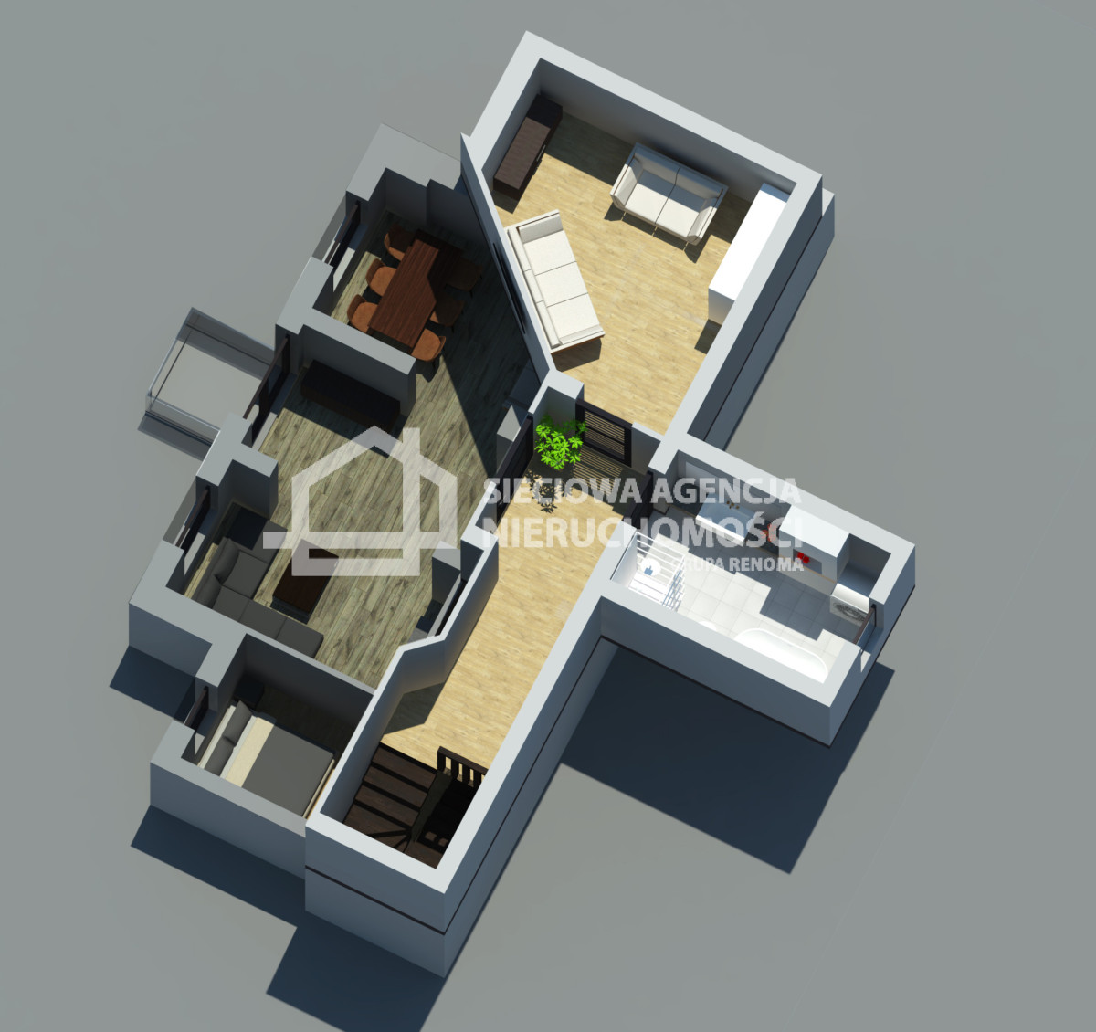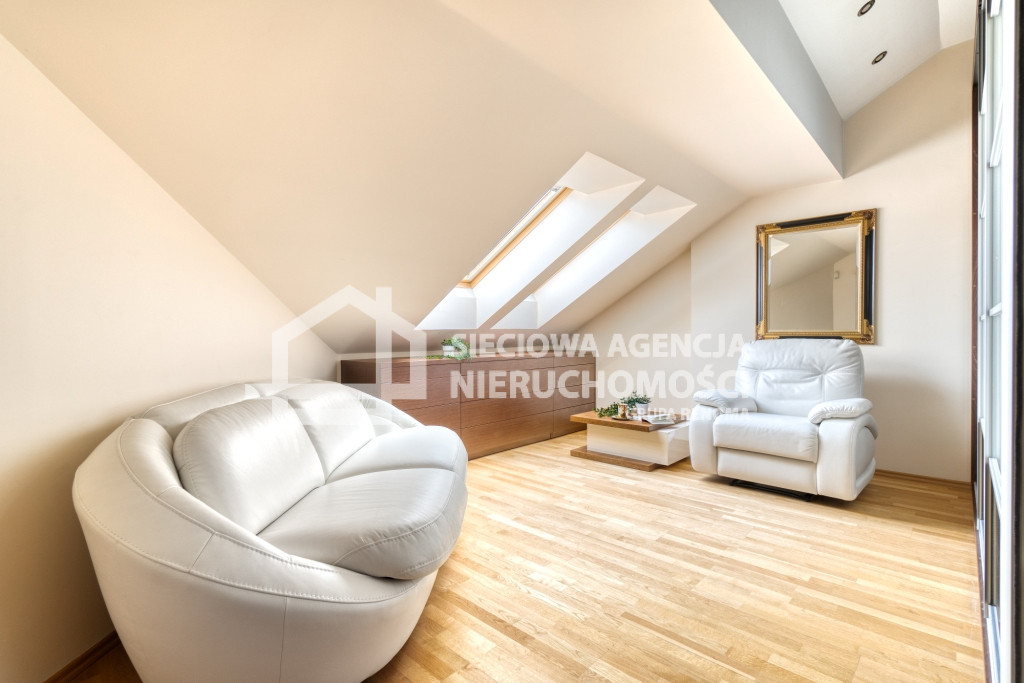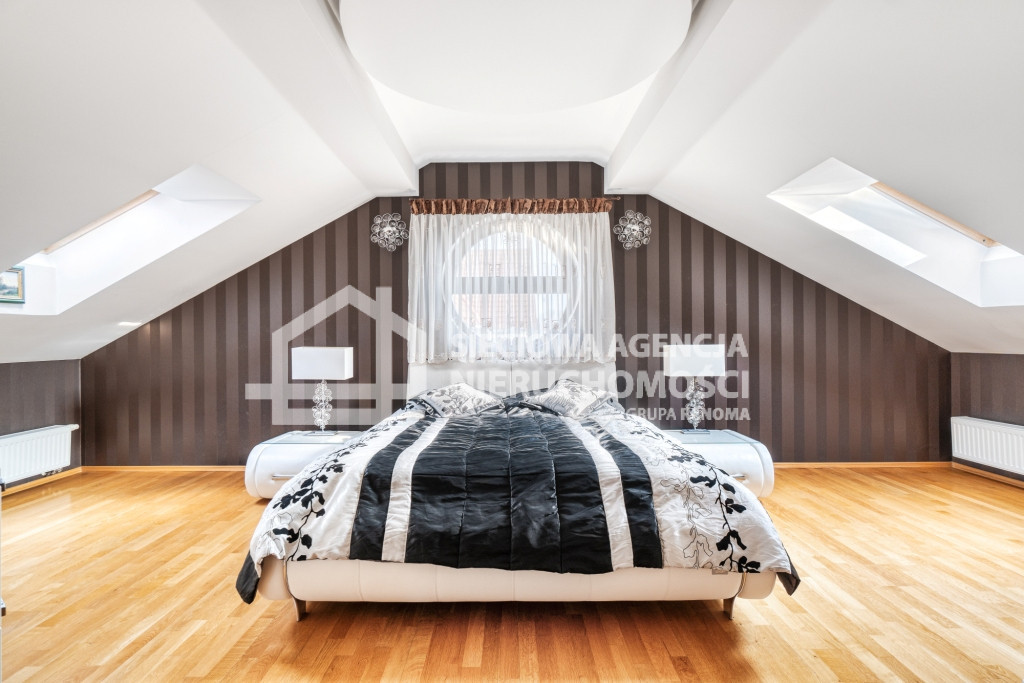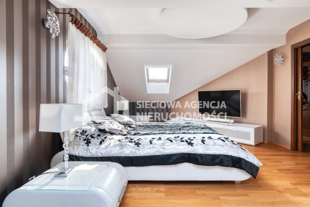 Poziom drugi to strefa nocna-dwie sypialnie, pokój, pokój łazienkowy z wanną, kabiną prysznicową, WC i oknem, garderoba i holl.