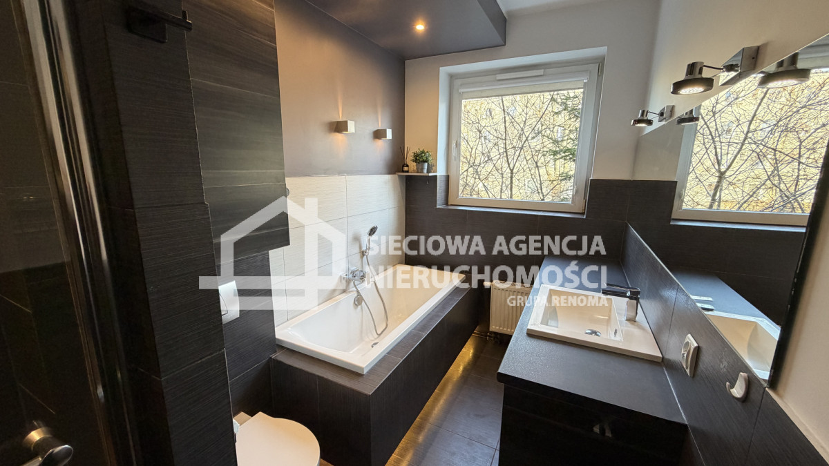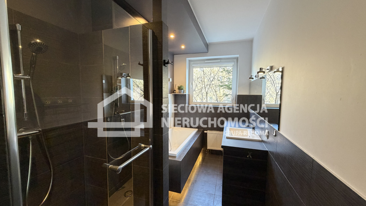 - łazienka z wanną, kabiną prysznicową, WC i oknem