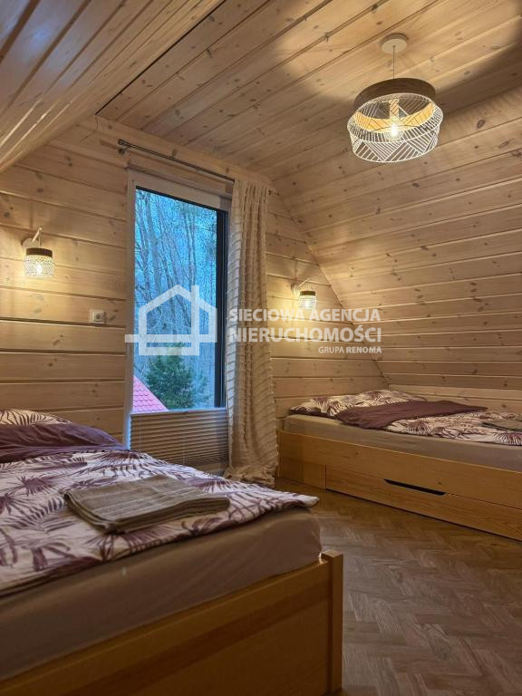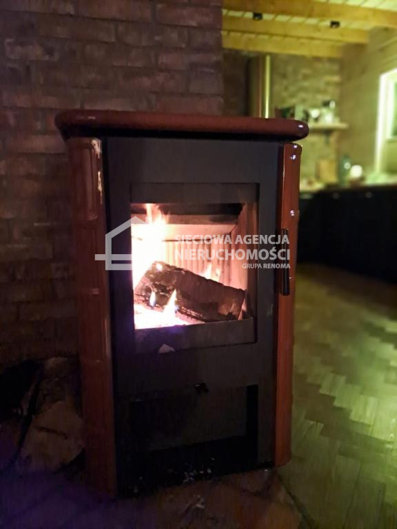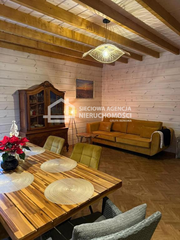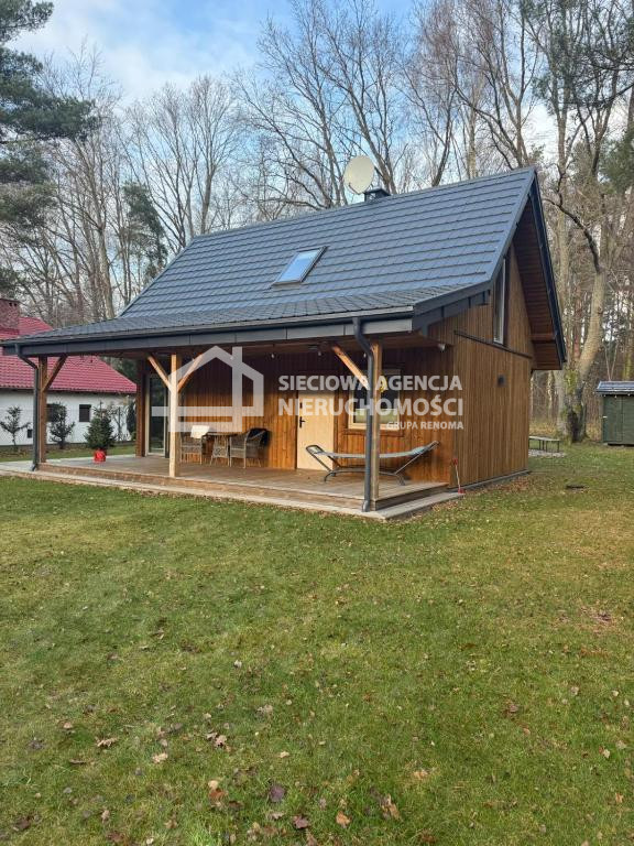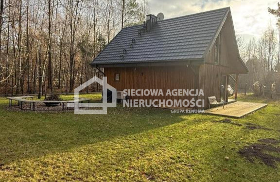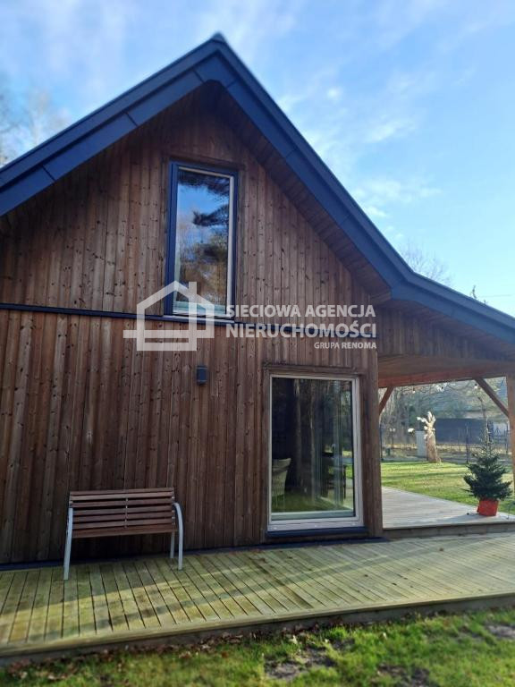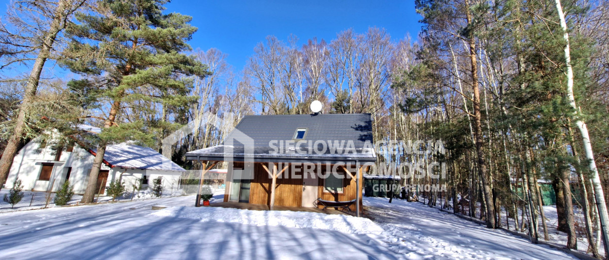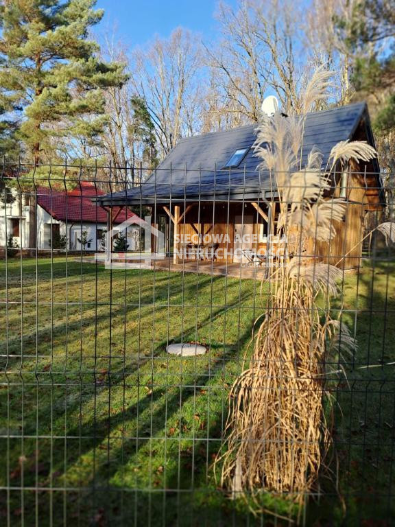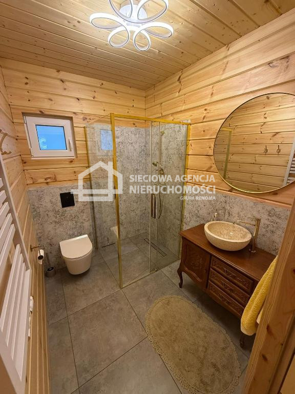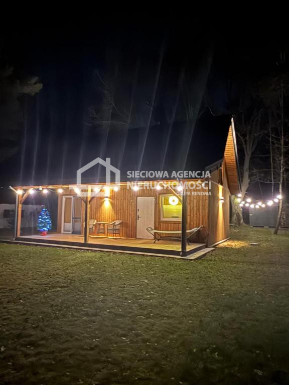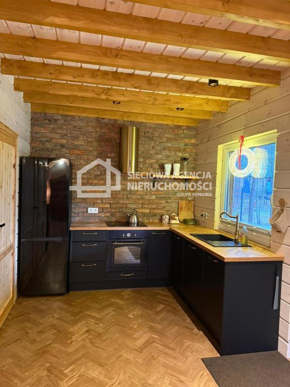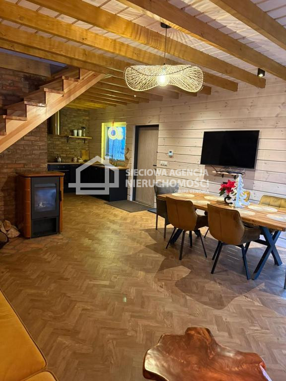 Dom drewniany o powierzchni 80 m2 na parterze salon z aneksem kuchennym,łazienka z prysznicem oraz pomieszczenie gospodarcze z pompą ciepła.W salonie znajduje się kominek .Na piętrze dwie sypialnie jedna z wanną i toaletą.