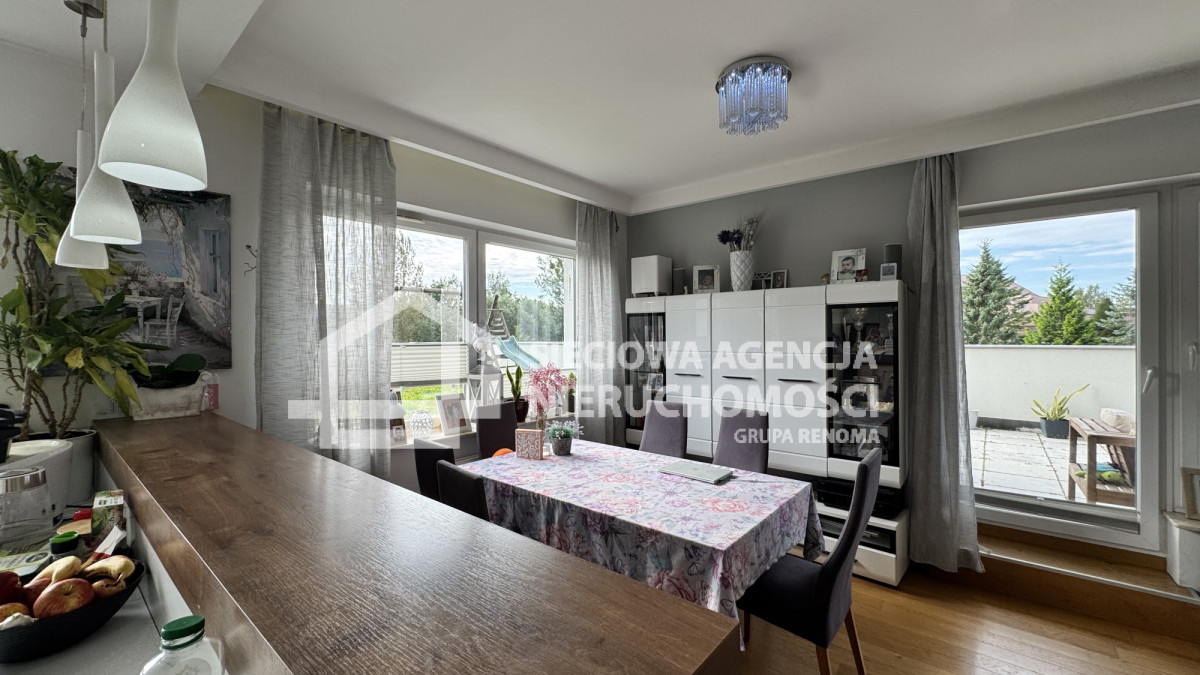 Z salonu i pokoju wyjście na taras o pow.138m2 a z niego widok na zieleń i przestrzeń!