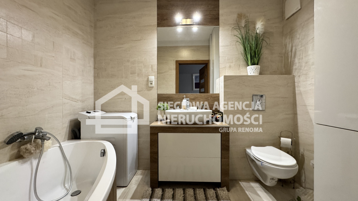 Nieruchomość o pow. 87,92m2 składa się z: salonu z aneksem kuchennym, trzech sypialni z szafami, dwóch łazienek z wanną i kabiną prysznicową, WC oraz przedpokoju z szafą w zabudowie.