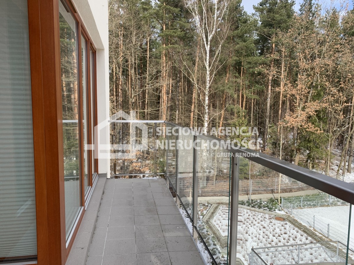 Z salonu i sypialni wyjście na narożny balkon, z którego rozciąga się widok na las.