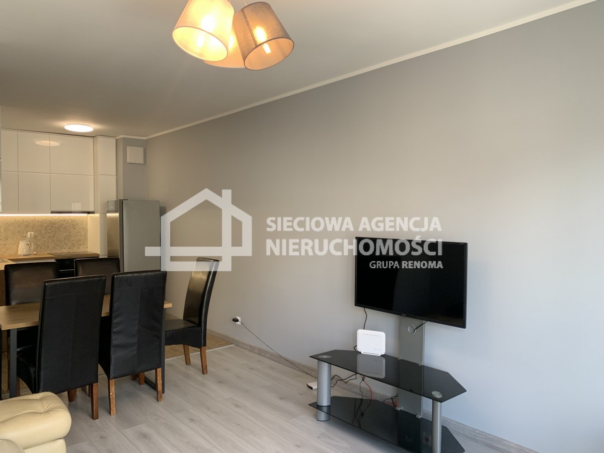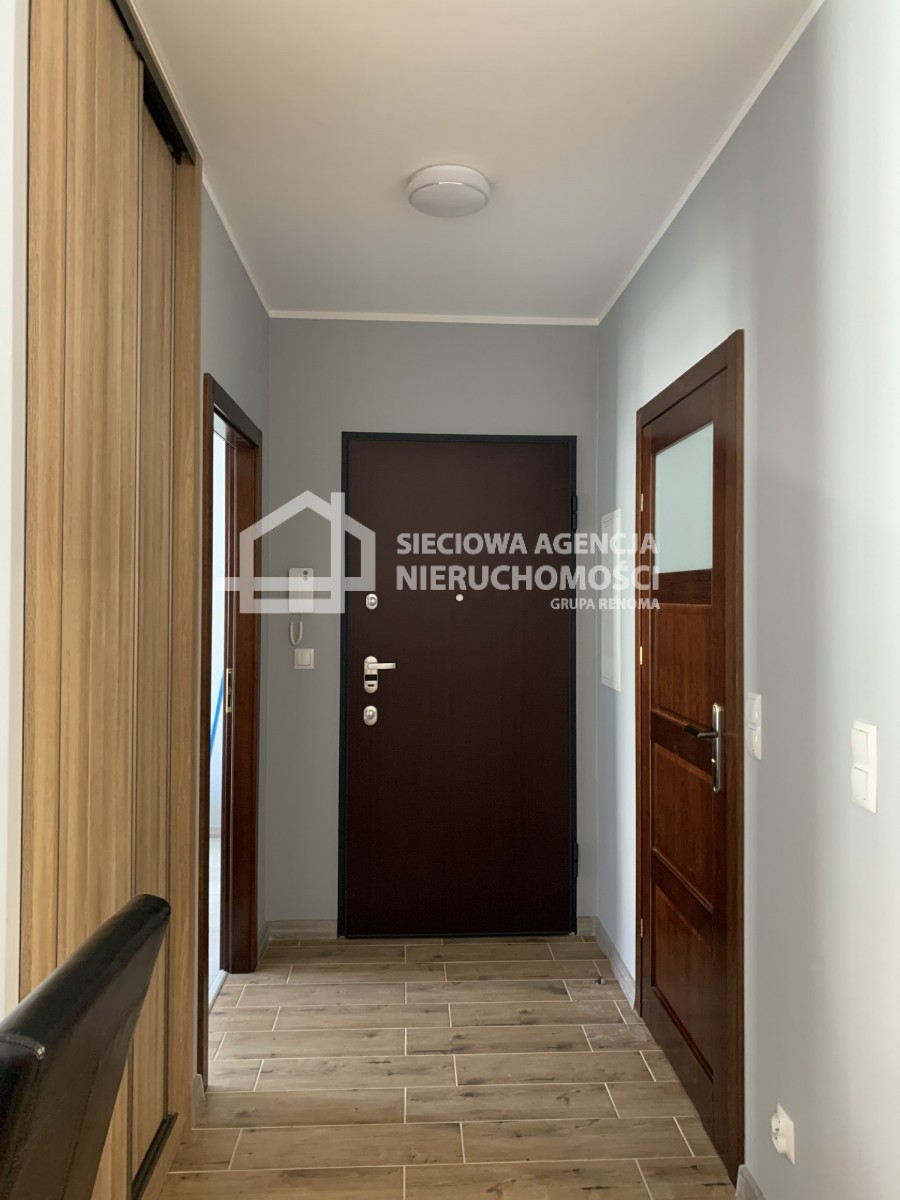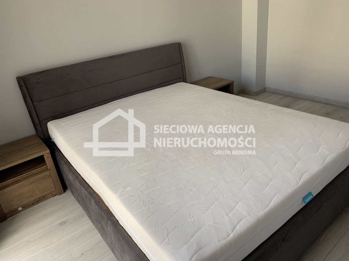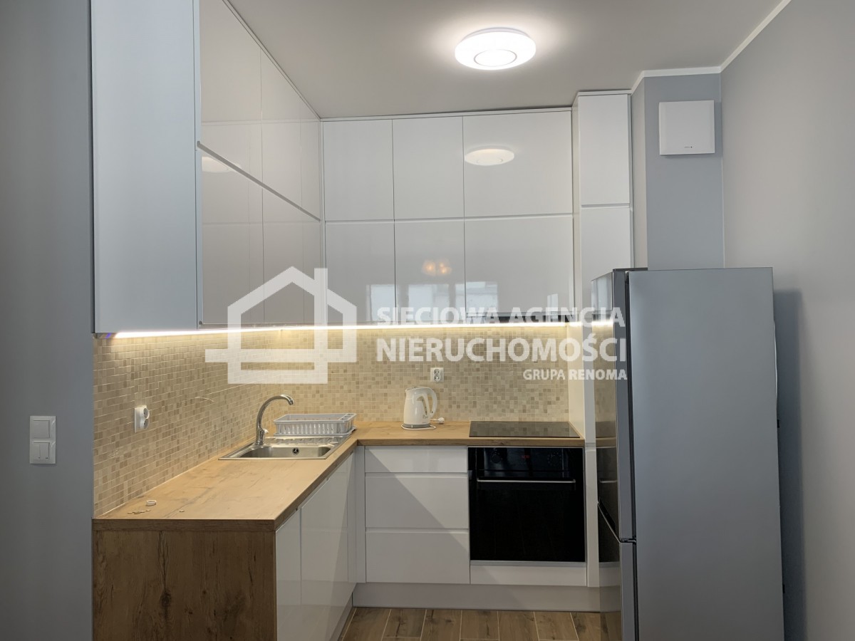 W skład mieszkania wchodzi salon z otwartą kuchnią i kompletem AGD, sypialnia, łazienka z kabiną prysznicową, WC i pralką oraz przedpokój z szafą w zabudowie.
