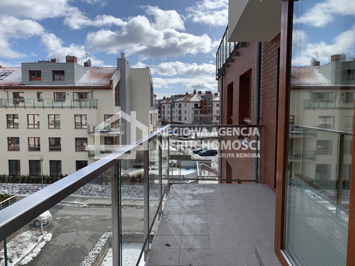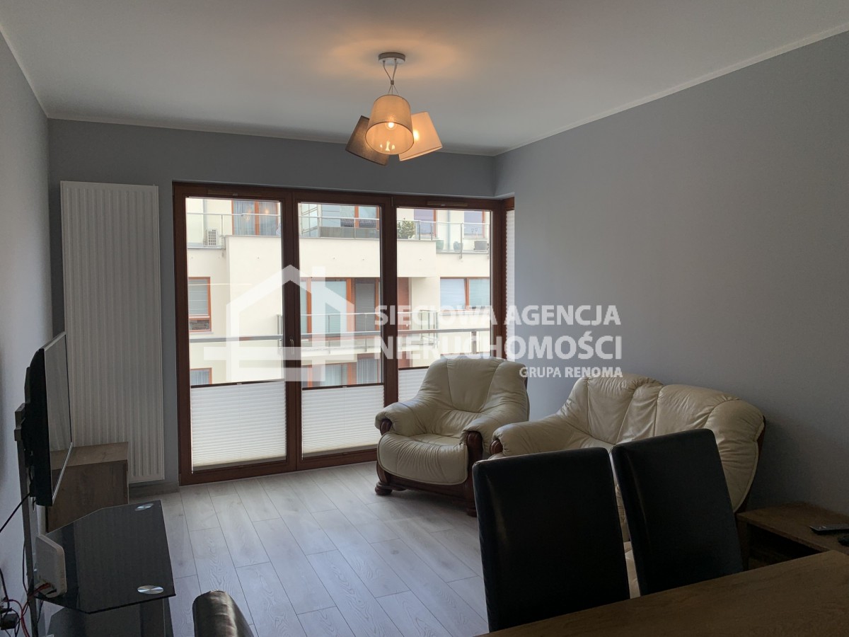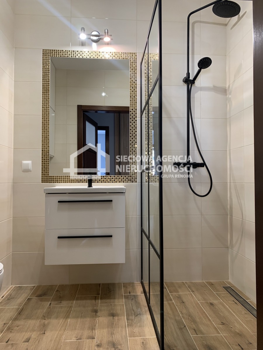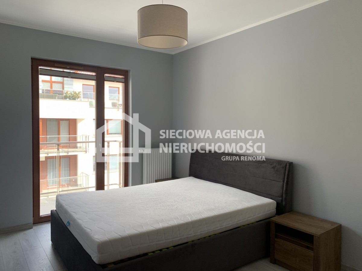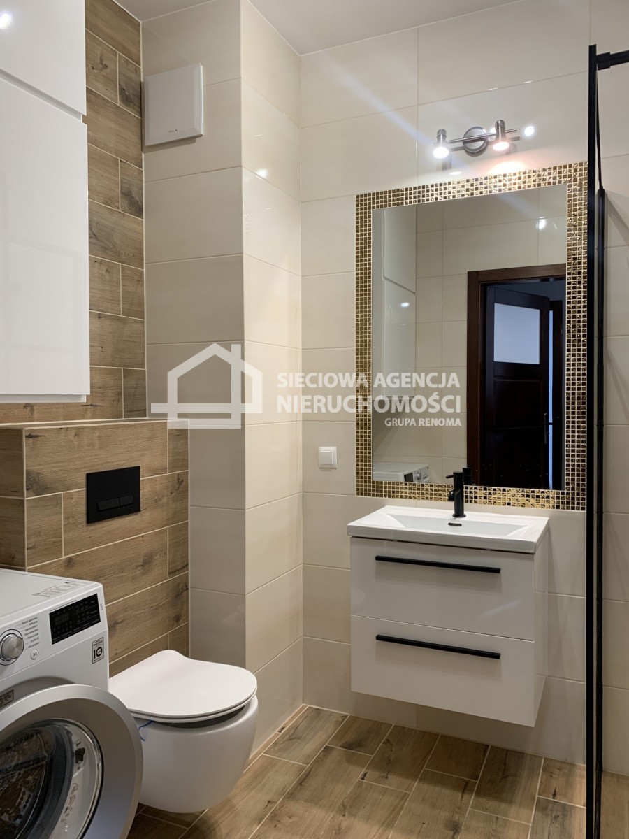 W skład mieszkania wchodzi salon z otwartą kuchnią i kompletem AGD, sypialnia, łazienka z kabiną prysznicową, WC i pralką oraz przedpokój z szafą w zabudowie.