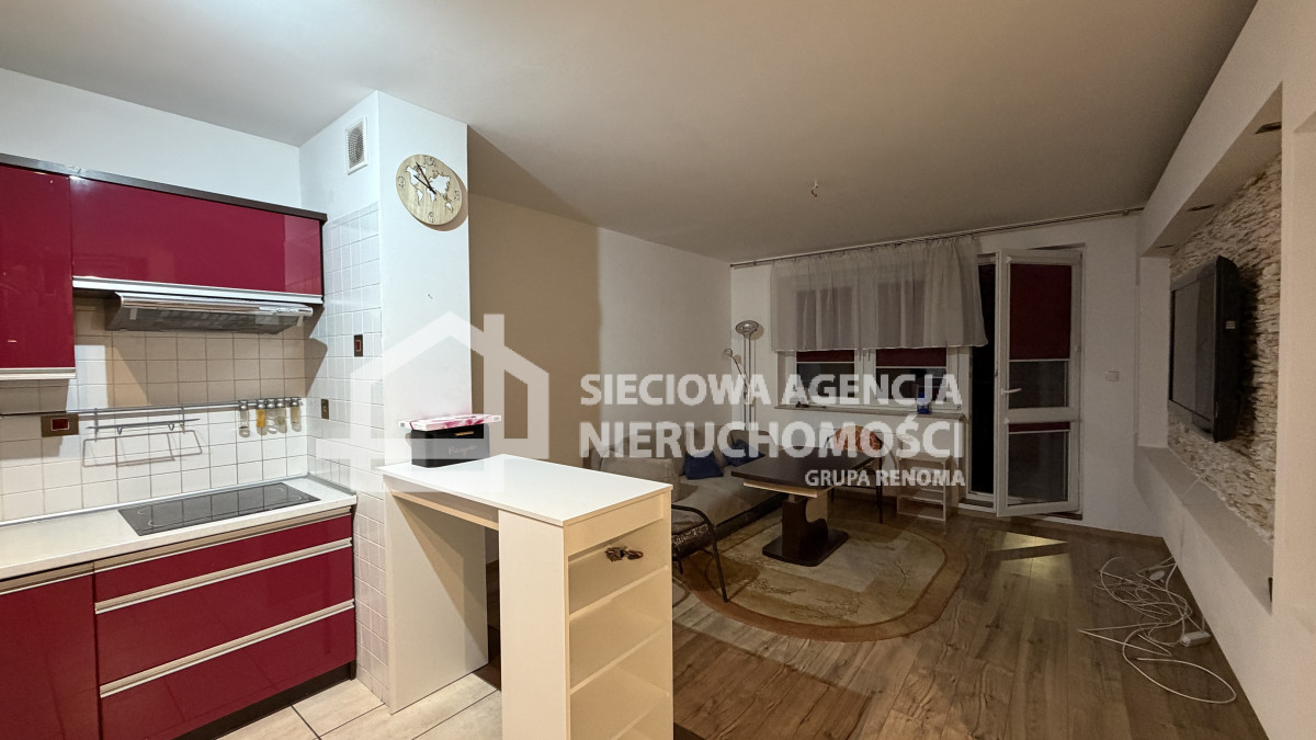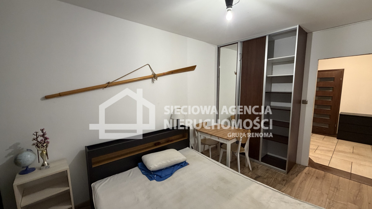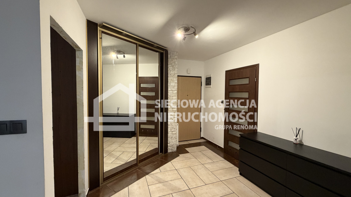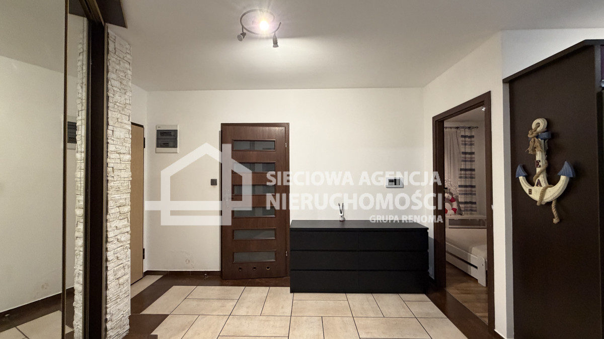 W skład mieszkania wchodzi salon z aneksem kuchennym, dwa pokoje( w jednym szafa w zabudowie), łazienka z oknem, wanną i WC oraz przedpokój z szafą w zabudowie.