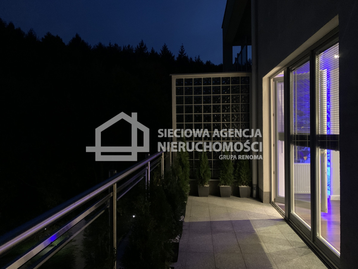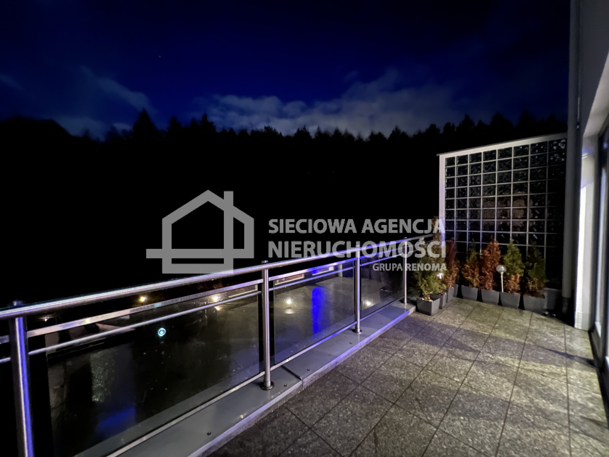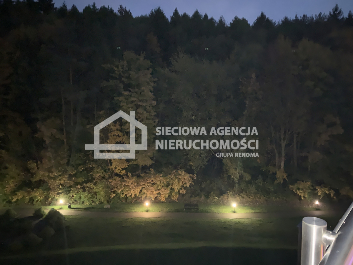 Z salonu wyjście na taras z widokiem na las, z sypialni i kuchni wyjście na balkon z widokiem na patio.
