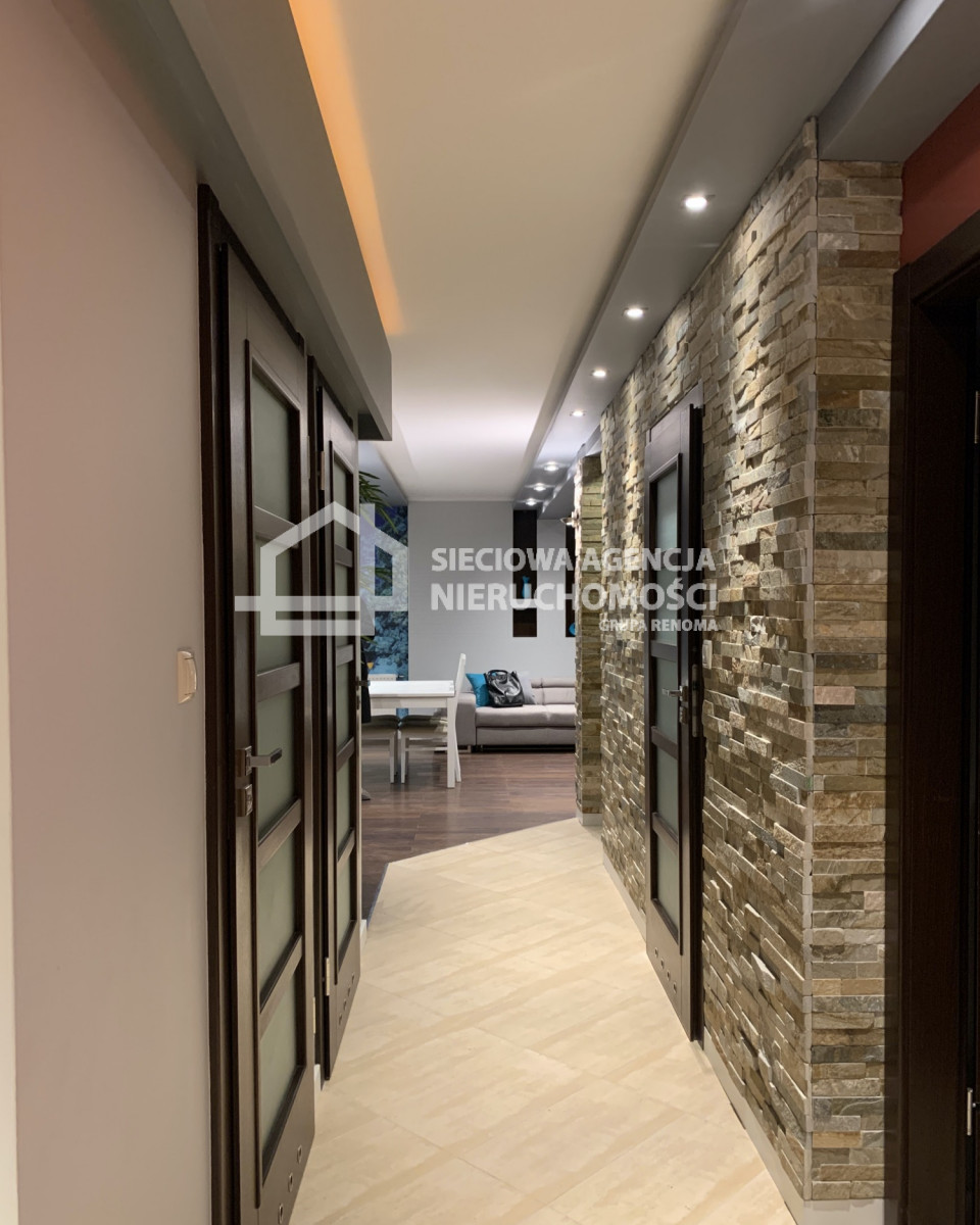 W skład apartamentu wchodzi salon, sypialnia z szafą w zabudowie, pokój, kuchnia z jadalnią, łazienka z wanną, kabiną prysznicową i WC , toaleta, komórka oraz przedpokój z szafą.