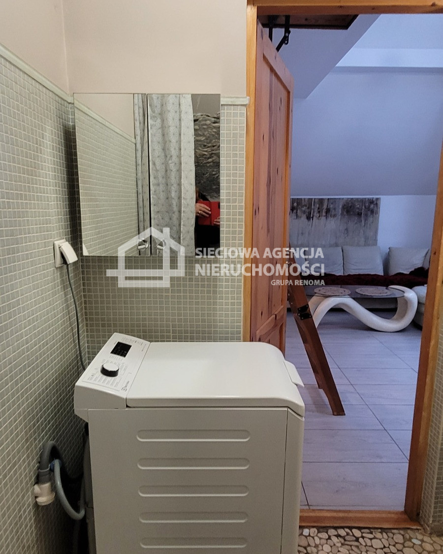 W skład mieszkania wchodzi salon z aneksem kuchennym, sypialnia ze skosem na antresoli, łazienka z kabiną prysznicową i WC.