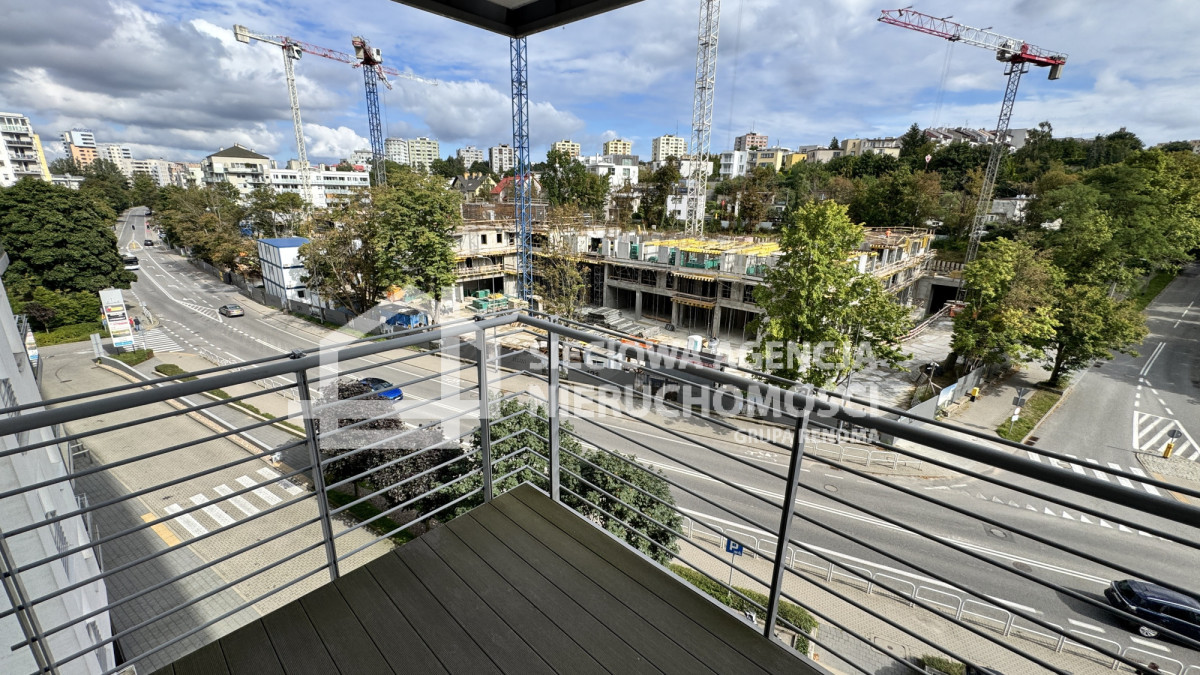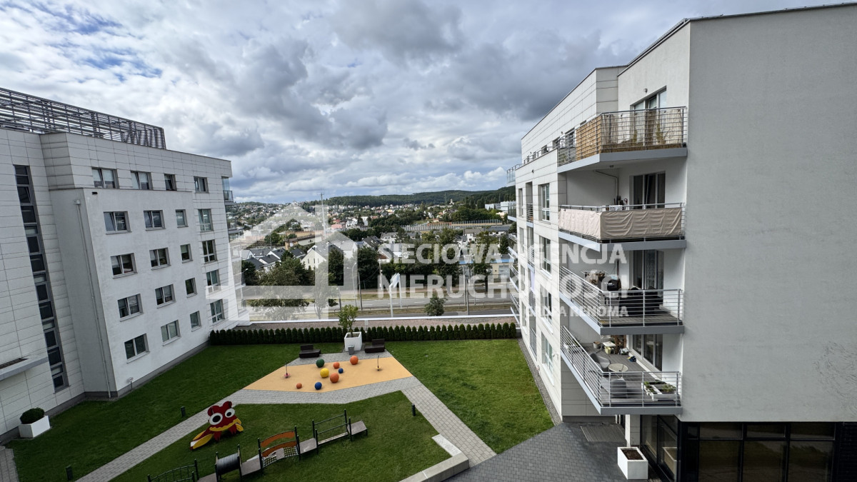 Z salonu i pokoju wyjście na loggię a z nich widok na panoramę miasta i las.