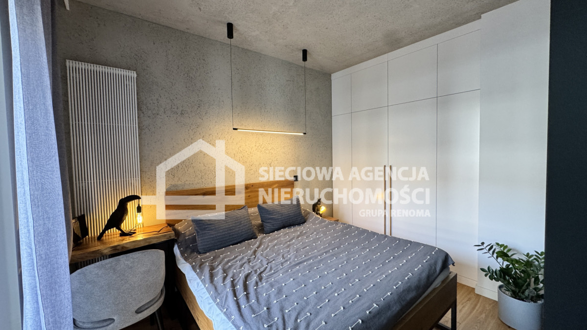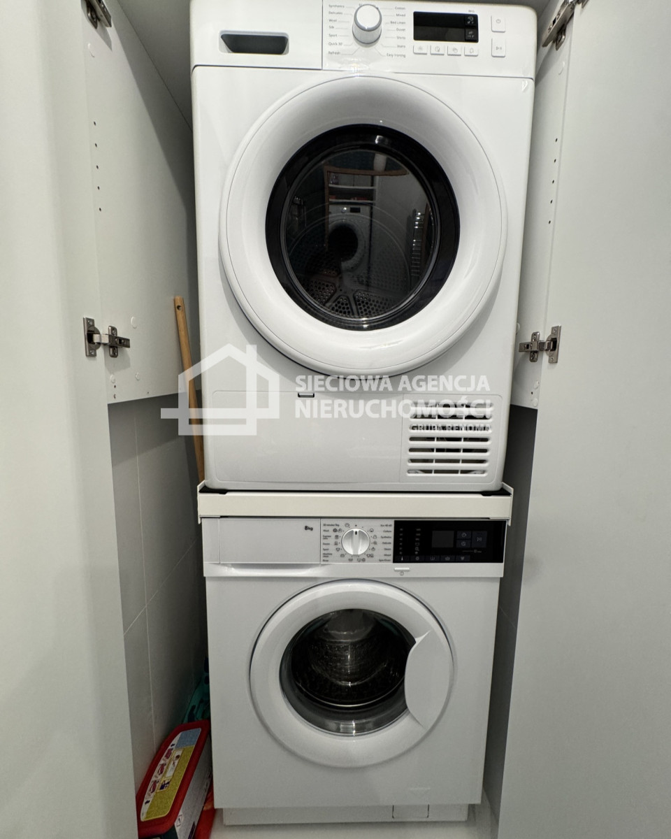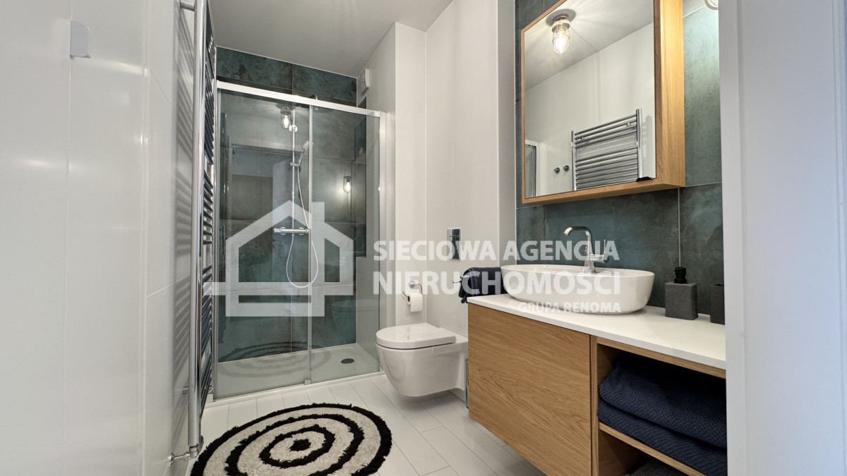 Apartament składa się z: salonu z aneksem kuchennym, sypialni z szafą w zabudowie, łazienki z kabiną prysznicową i WC( tu pralka i suszarka) i przedpokoju z szafą w zabudowie.
