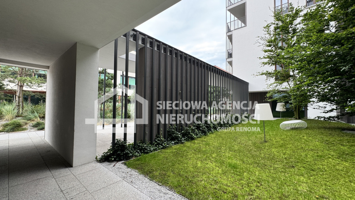 Z salonu wyjście na loggie z widokiem na pięknie zagospodarowane patio i zieleń.