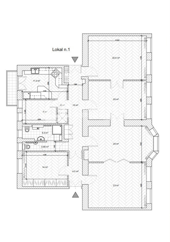 W skład mieszkania wchodzi: 6-pokoi, kuchnia z oknem, łazienki z kabiną prysznicową i WC, toaleta, oraz korytarze.