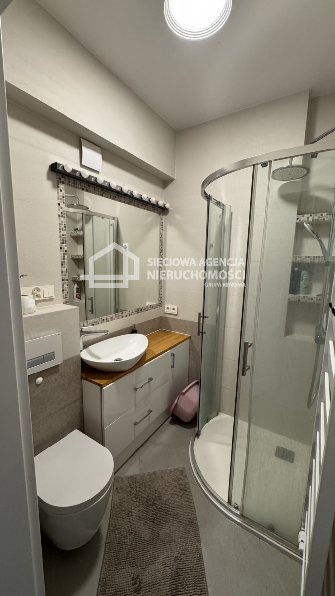 Łazienka: prysznic, duże podświetlane lustro.
