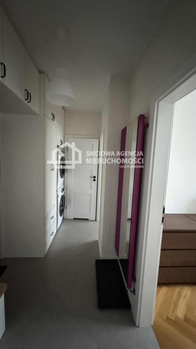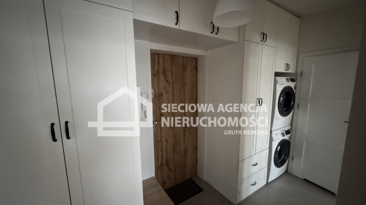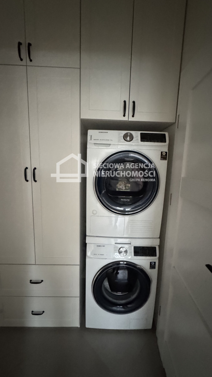Przedpokój: duża szafa w zabudowie, pralka i suszarka Samsung.